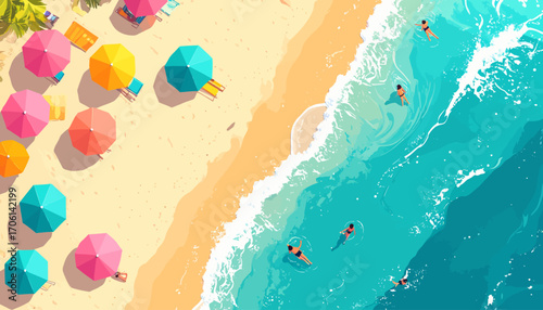 Aerial top-down view of a vibrant summer beach with colorful umbrellas and people swimming in turquoise water