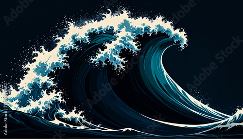 Stylized blue ocean wave with intricate details and swirling foam.