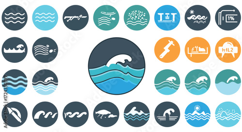 Collection of water wave symbols representing ocean currents and surface conditions in a modern, minimalist style, perfect for weather apps and environmental reports.