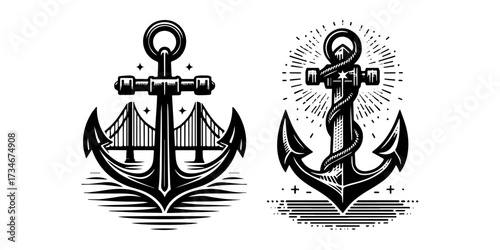 Anchor illustrations with bridge and rope nautical designs.