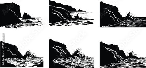 Dramatic coastal cliff and ocean wave silhouettes in black and white vector style for nature scenery, maritime landscape, sea foam splash illustration