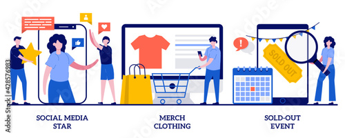 Social media star, merch clothing, sold-out event concept with tiny people. Celebrity media engagement vector illustration set. Account monetization, branded design, show overbooking metaphor.