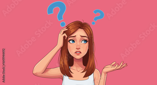Portrait of a confused girl with questions, feeling lost and uncertain. Cartoon character design on a pink background.