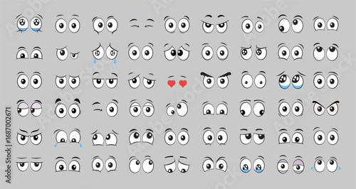Comic cartoon eyes set. Human facial expressions with angry, happy, surprised, and funny looks. Doodle caricature characters showing emotions. Isolated vector illustration