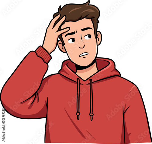 Flat illustration of young man with hand on head looking up thoughtfully, confused expression isolated on white background