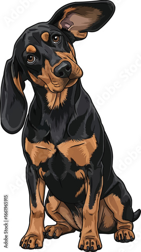 Austrian Black and Tan Hound dog sitting with tilted head curious look