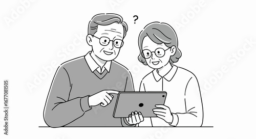 Senior couple using tablet, both are puzzled by tablet, looking at screen with quizzical expressions. Senior couple using tablet for the first time, they look unsure.
