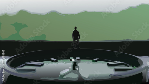 Silhouette man observing vast landscape from high vantage point, symbolizing ambition and future.