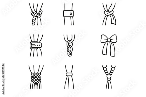DIY Curtain Tiebacks Icons. Outline icon set of DIY curtain tiebacks: rope knot, leather strap, scarf tie, belt buckle tie, chain