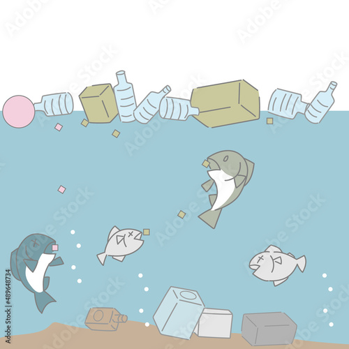 Micro plastic pollution concept. Microplastic in fish. Vector illustration.