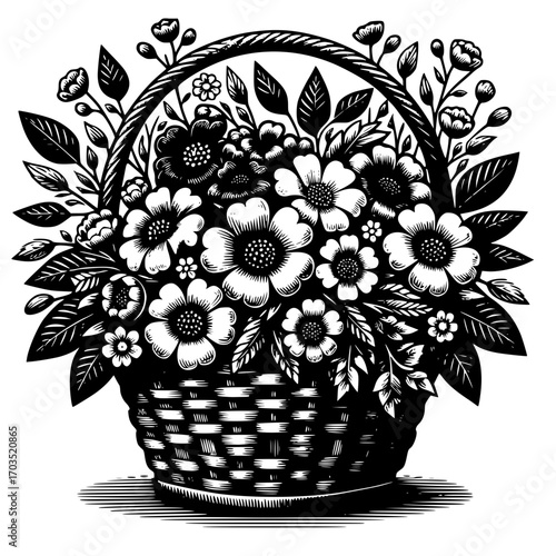Adobe Illustrator Artwork: A vector illustration of a wicker basket filled with colorful flowers