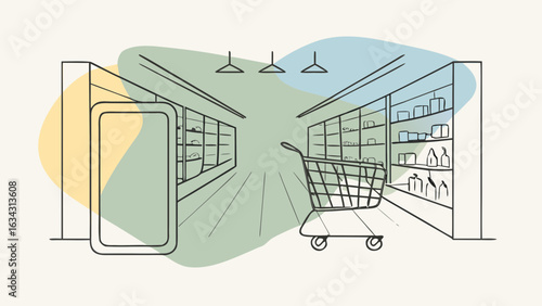 Online store.Smartphone turned into internet shop.Isometric Shopping trolley and smartphone with awning.Connect a bank card and payment of purchases. store rating.Abstract isolated on black background