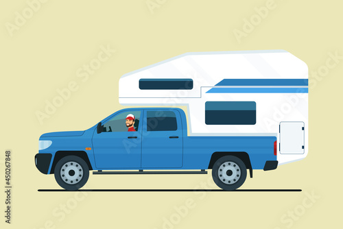 Pickup truck with a touring trailer mounted in the back isolated. Vector illustration.