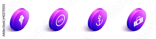 Set Isometric Ice cream in waffle cone, Location with SOS, Anchor and Suitcase icon. Vector