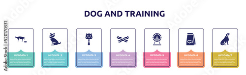 infographic element template with dog and training outline icons such as cone of shame, gold fish, pet comb, dog eating vector.