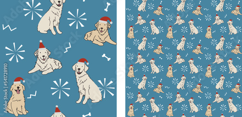Seamless dog pattern, winter Happy Christmas texture. Square format, t-shirt, poster, packaging, textile, socks, textile, fabric, decoration, wrapping paper. Trendy hand-drawn  Samoyed dog breed.