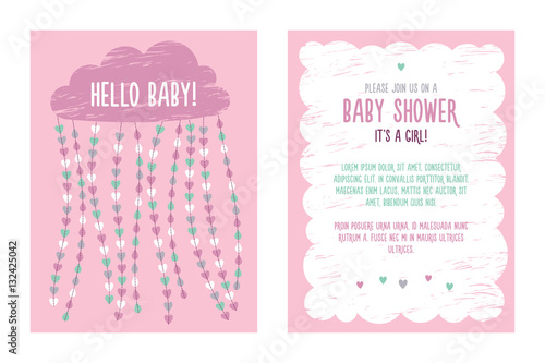 Cute baby shower watercolor invitation card for baby and kids new born celebration. Its a girl, Its a boy card with pink and grey clouds, sun and hearts.