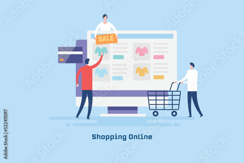 Ecommerce online shopping concept, people browsing cloths online, man standing with trolley, retail store sales.
