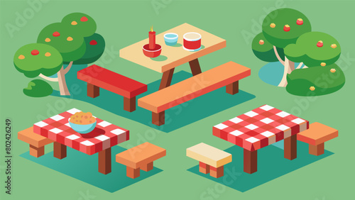 The parks metal benches and colorful picnic tables covered with red checkered cloths adorned with sctious soul food dishes.. Vector illustration
