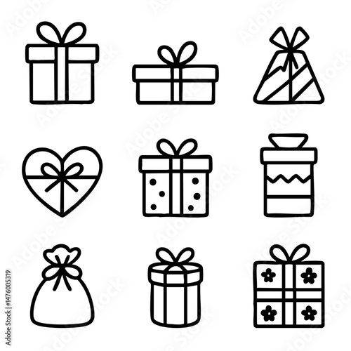 Hand drawn gifts collection. Present box with ribbons. Doodle illustrations. Christmas gift symbols.