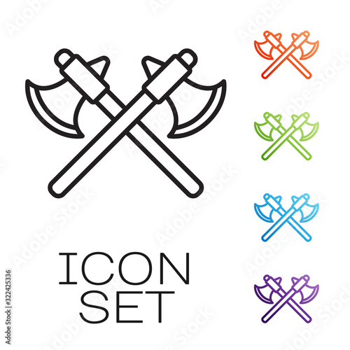 Black line Crossed medieval axes icon isolated on white background. Battle axe, executioner axe. Medieval weapon. Set icons colorful. Vector.