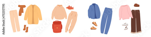 Vector illustration of a beautiful dress-up doll with stylish fashion clothes, jeans pants, jackets, a dress, sneakers, and boots. Five combinations of fall clothing. Female Fashion creator.