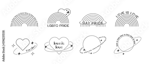 Trendy minimalist queer aesthetic linear shapes. Y2K pride month 90s outline design. Set of retro graphics with typography. LGBTQ logo. Vector illustration.