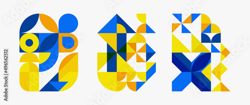 Set of geometric pattern element. Collection of abstract circle, square, triangle and polygon shape with blue and yellow color. Modern and trendy design on white background for decor, cover, print.