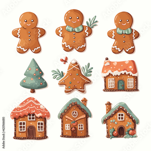 Cute cookies set. Gingerbread house, gingerbread cookies isolated on white. Vector for stickers, cards, scrapbooking.