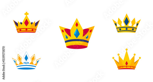 Illustration of a crown in various designs and orientations. Ideal for luxury, royal, leadership, and status-related projects, representing power and nobility.