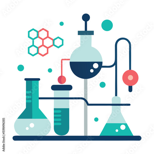 Colorful Laboratory Setup Illustration Showcasing Experiments and Scientific Process Depiction Testing Substances in Chemistry