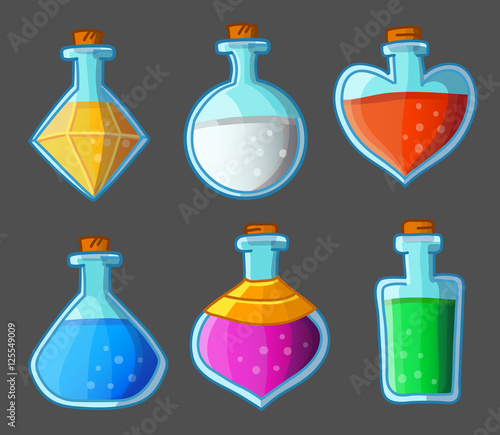 Twelve Unique Potion Bottles Arranged in a Grid Vector Illustration for Fantasy Gaming or Halloween Designs