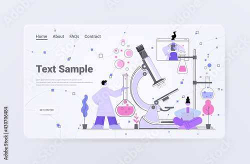 Lab assistants doing research. People in white coats using microscope, test tubes flat vector illustration. Laboratory, chemistry, medical test concept for banner, website design or landing web page