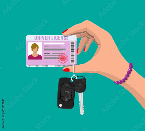 Woman teacher give driver licence for female student. Happy new driver after passing the driving test. Modern vehicle near. Driving school