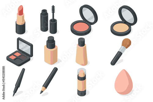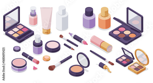 Makeup set. Realistic cosmetic products: eye shadow, powder, blush, eyeliner, concealer, lipstick and lip gloss, foundation, nail polish, mascara, and makeup brushes isolated on white background.