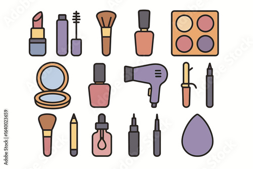 Beauty and makeup flat icons set – cosmetic, grooming essentials symbols
