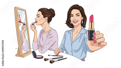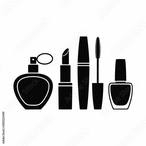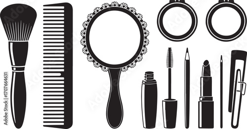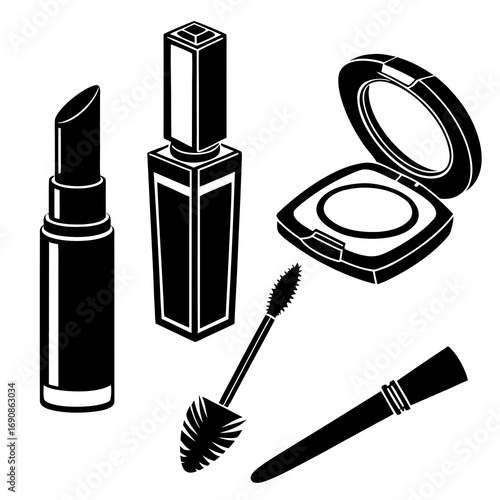 Essential makeup tools: cosmetic icons featuring lipstick, mascara, and brushes for beauty enthusiasts. Vector icons