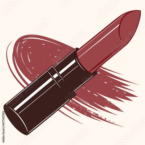 Simple greeting card with lipstick smear and brush. Professional makeup artist background. Black fashion illustration on white background. Hand drawn art in watercolor style