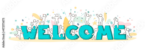 Cartoon word Hello. Doodle cute miniature scene of workers big letters. Hand drawn vector illustration for business and friendship design.