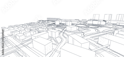 Blueprint of a city building under construction with a dark blue background, featuring wireframe structures in various shapes and sizes. The design highlights architectural details.