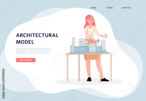 Happy young woman constructs city miniature. Girl makes school project of handmade small scale building and liberty statue. Architectural designer work. Flat style cartoon vector illustration.