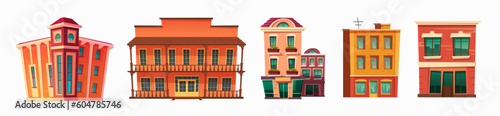 Retro city building vector cartoon house shop icon on white background. Urban office exterior front view set. Hotel business and store office cityscape object. Barber window with vintage window