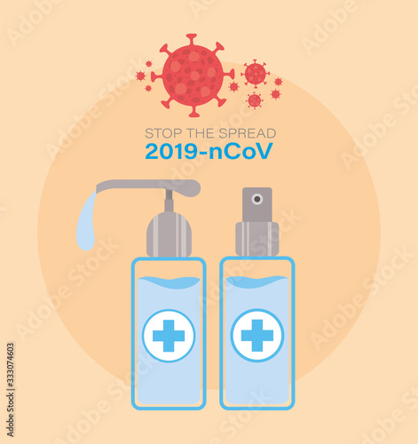 Hands washing soap dispenser and stop the spread with 2019 ncov virus text vector design