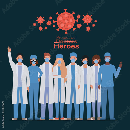 Women and man doctors with masks and uniforms against 2019 ncov virus vector design