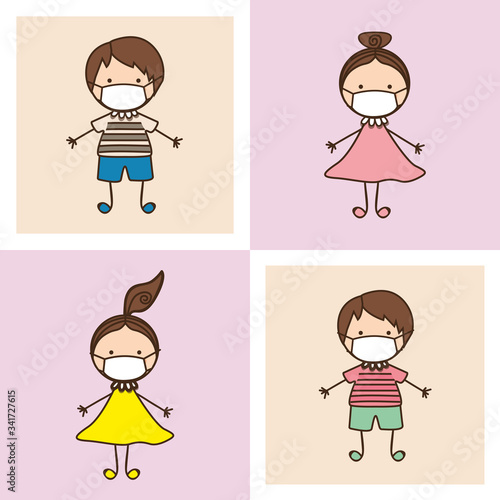 Girls and boy kids with masks against 2019 ncov virus vector design