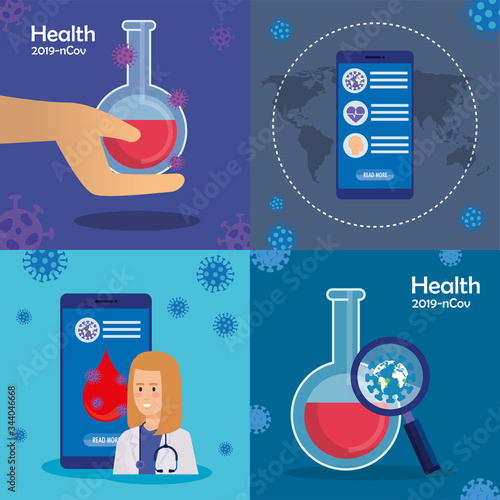set banners of campaign of stop 2019 ncov online vector illustration design