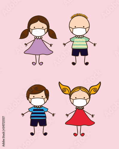 Boys and girls kids with masks against 2019 ncov virus vector design