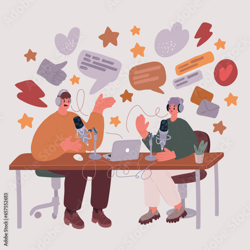 Vector illustration of Focused video call conversation. Skilled bloggers together streaming stories online in social network, female mentor sharing knowledge.