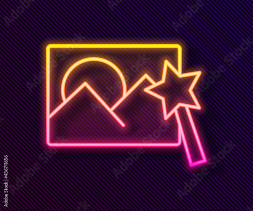 Glowing neon line Photo retouching icon isolated on black background. Photographer, photography, retouch icon. Vector