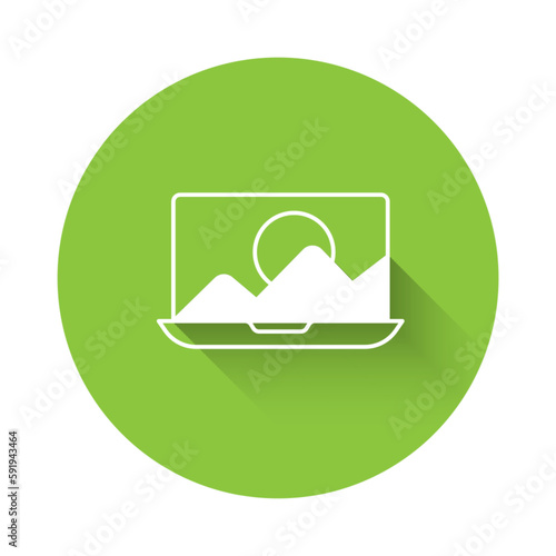 White Photo retouching icon isolated with long shadow background. Photographer, photography, retouch icon. Green circle button. Vector